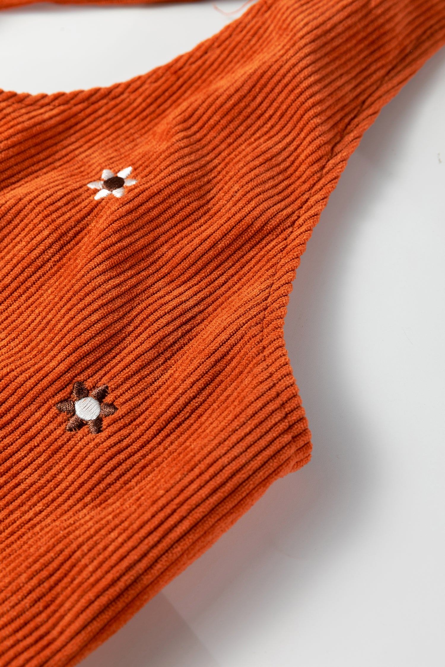 - Flower embroidery adds delicate botanical charm to this corduroy overall dress.