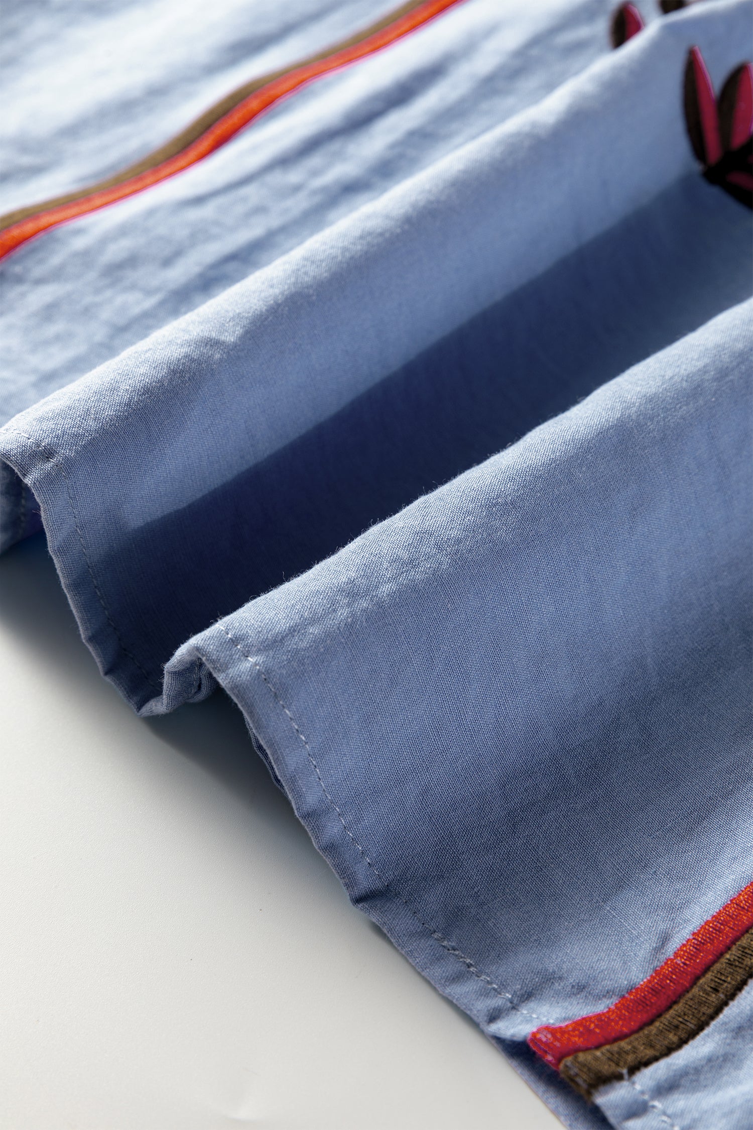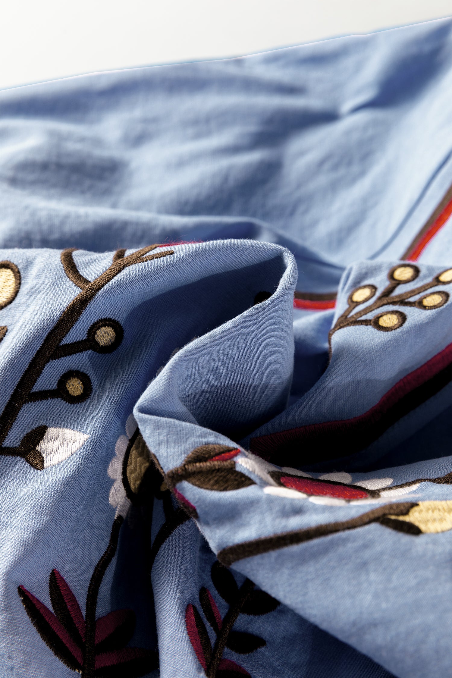 - Floral embroidery adds delicate botanical charm.
